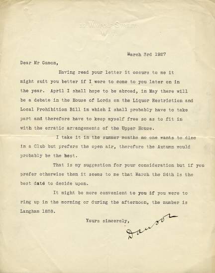 Two Typewritten Letters Signed to Mr Gamon, 2 pages 4to, 32 Wimpole Street, 26 February and 3 March 1927. Accepting an invitation from the Whitefriars Club and attempting to set a date, in the earlier letter naming two days in March and in the second suggesting that the autumn might be better. '... In May there will be a debate in the House of Lords on the Liquor Restriction and Local Prohibition Bill in which I shall probably have to take part and therefore have to keep myself free so as to fit in with the erratic arrangements of the Upper House. ...' £45 [No: 4226] The image is of one letter only. |