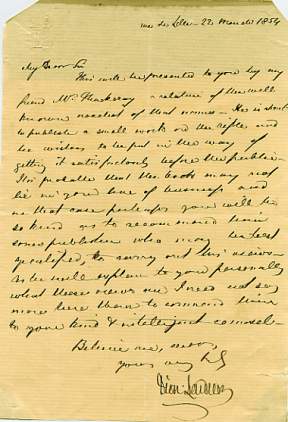 Autograph Letter Signed to an unnamed correspondent ('My dear Sir'), 1 page 8vo (tipped at the head to the remains of an album leaf), rue de Lille, 22 March 1854. Recommending Mr Thackeray ('a relative of the well known novelist of that name') who is about to publish a work on the rifle. '... he wishes to be put in the way of getting it satisfactorily before the public. ... I need not say more here than to commend him to your kind & intelligent counsel.' £45 [No: 5573] |