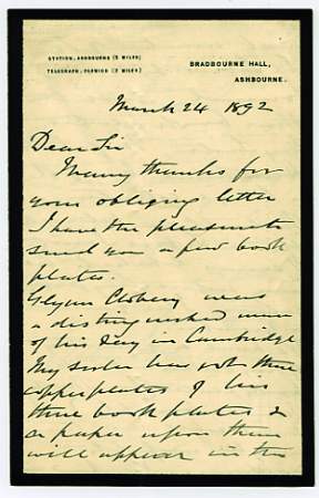 Autograph Letter Signed to an unnamed correspondent, 3 pages 8vo, Bradbourne Hall, Ashbourne, 24 March 1892. Promising to send book plates of, amongst others, Robert Glynn (afterwards Clobery) and announcing an interesting article on the subject from the Ex Libris Society. £45 [No: 6692] The image is of the first page only. |