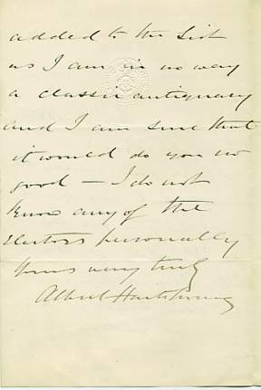 Autograph Letter Signed to Price, 2 pages 8vo, on embossed writing paper of the Royal Archaeological Institute of Great Britain and Ireland, 8 November 1885. Declining to add his name to the list supporting Price for the post of Director of the Fitzwilliam Museum, Cambridge, but wishing him success in his application. £45 [No: 6693] The image is of the second page only. |