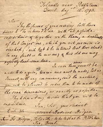 Autograph Letter Signed to an unnamed correspondent, 1 page 4to, Tolpuddle near Piddletown, Dorset, 12 August 1793. A curious letter requesting the repair or replacement of an item, to be as exact duplicate of the original as possible ('I cannot, with any convenience, send the machine'). £45 [No: 7446] |