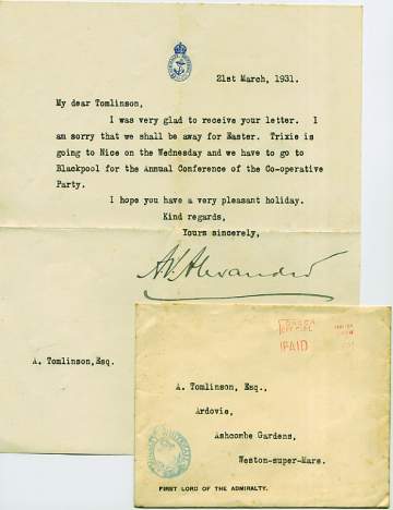 ALEXANDER, Albert Victor, Earl (1885-1965). Politician. First Lord of the Admiralty.