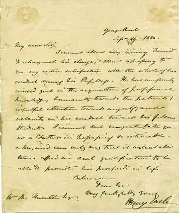 Autograph Letter Signed to William M Moulton, 1 page 4to (traces of former mounting on the back), George Street [Hanover Square, London}, 29 September 1834. Reporting, in glowing terms, on the outstanding conduct of Moulton's son while a pupil of Earle's. 'He has uniformly evinced zeal in the acquisition of professional knowledge, humanity towards the patients, respectful attention towards myself; and urbanity in his conduct towards his fellow students. ...' £125 [No: 8188] |