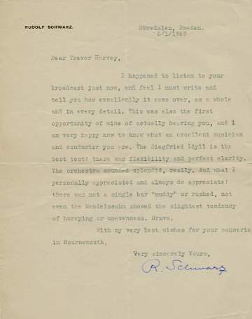 Typewritten Letter Signed in English to the musicologist and conductor Trevor Harvey, 1 page 4to, Sävedalen, Sweden, 5 January 1949. Congratulating him on the excellence of his broadcast performance. '... The Siegried Idyll is the best test: there was flexibility and perfect clarity. The orchestra sounded splendid, really. And what I personally appreciated and always do appreciate: there was not a single bar "muddy" or rushed. ...' £85 [No: 26272] |