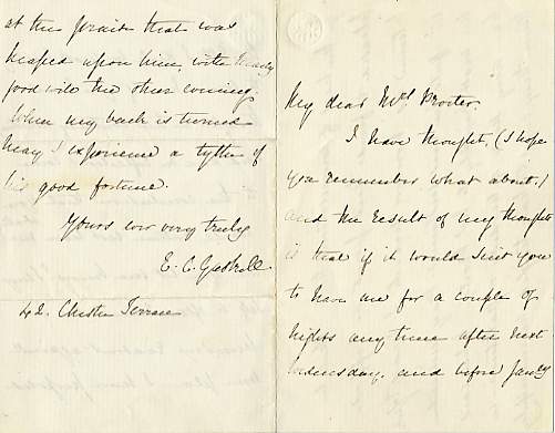 GASKELL, Elizabeth Cleghorn (1810-1865). Novelist. Autograph Letter Signed ('E.C. Gaskell') to [Ann] Procter, wife of Bryan Waller Procter (1787-1874), 4 pages small 8vo, 42 Chester Terrace, no date (watermark. 1850 or 1856). Proposing to visit her for a few days and mentioning the encomiums heaped on her husband. '... Now if you have thought in the contrary direction, and have on reflection come to the conclusion that you would rather not have me at all, will you let me know? I myself so often remember a hundred reasons against some place I have proposed in the heat of conversation. ... Pray remember me most kindly to Mr Procter. If his ears have any sense of modesty or gratitude in them they ought to have tingled unmercifully at the praise that was heaped upon him with heady good will the other evening. When my back is turned may I experience a tythe of his good fortune?' Ann Procter's was one of London's most prominent literary hostesses. Thackeray praised her 'tremendous energy and genius for gossip'. Not in The Letters of Mrs Gaskell, ed. Chapple and Pollard (1997), nor Further Letters (2000), and apparently unpublished. [No: 26022] The first image is of the first and last pages. The image links to a larger or more detailed version.